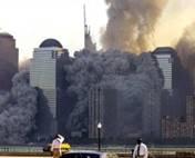 This photo was taken after the collapse of WTC2 and before the collapse of WTC1, half an hour later. It must surely lay to rest the idea that the Towers were blasted to bits in mid-air. Only large chunks of falling debris, as shown in the previous photo, could cause this kind of destruction. But anyway, to truly explode a 30 story building in