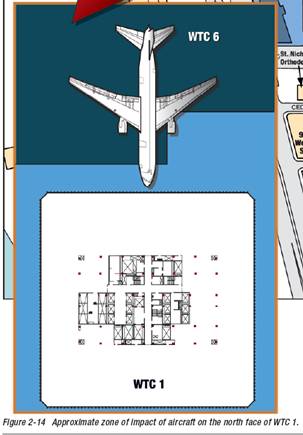 of impact damage on WCT 2 (source: www.geocities.com/debunking911) While no-one can verify the details of such a visualisation, it would be at the very least likely that a significant number of core columns would have been damaged by the impact alone, prior to any weakening by fire. A passenger jet can crash and initiate intense fires, even, apparently, without its aviation fuel igniting, as in this example of an Air France accident:
