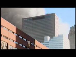 Jones: “Correct – the WTC Towers were designed to withstand forces caused by large commercial aircraft – we can agree on that. MIT’s Thomas Eagar also concurs “because the number of columns lost on the initial impact was not large and the loads were shifted to remaining columns in this highly redundant structure” (Eagar and Musso, 2001).” Jones is stating here a widely circulated opinion: that the Towers were designed to withstand the impact of a commercial plane. But the CD theorists consistently overlook two factors here. Firstly that the designers had in mind an aircraft coming in to land at New York airport, at speeds of around 180 mph (according to the FEMA report, page 1:17). But the aircraft hit the towers at an average of nearly three times that speed. Given that the impact damage hinges on the kinetic energy of the projectile, which rises with the square of speed, the planes hit the Twin Towers with nearly nine times the impact anticipated. (Note that the NIST report - on page 6 - contradicts this argument by stating that the Towers were designed for a 600 mph impact. I would be pleased to hear from anyone who can settle this discrepancy one way or the other.) Secondly, design is an art not a science: the Titanic was designed not to sink; the space shuttle was designed not to explode on takeoff, and designed not to break up on re-entry. Etc. Jones: “They do NOT explain how steel-column temperatures above 800oC were achieved near-simultaneously due to burning office materials. NIST notes that office materials in an area burn for about 15-20 minutes, then are consumed away (NIST, 2005, pp. 117, 179). This is evidently not long enough to raise steel column temperatures above 800oC as required in the Bazant & Zhou model, given the enormous heat sinks of the structures. And to have three buildings completely collapse due to this unlikely mechanism on the same day strains credulity.” Jones is presenting perhaps the core issue that requires explanation: the high temperatures in all three fires. What the CD theorists consistently attempt to promote however is that the fires in the three buildings were standard ‘office fires’ which should not have led to collapse. This is simply not the case. In the case of the Twin Towers the impact and presence of the planes ensures that the structural damage and ensuing fires were like nothing previously encountered. Some images are essential here to convey the magnitude of the situation.