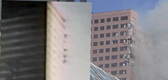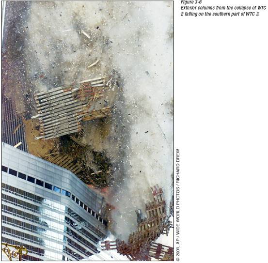 The next photo shows the destruction wreaked on WTC 3 by debris falling from WTC 2.